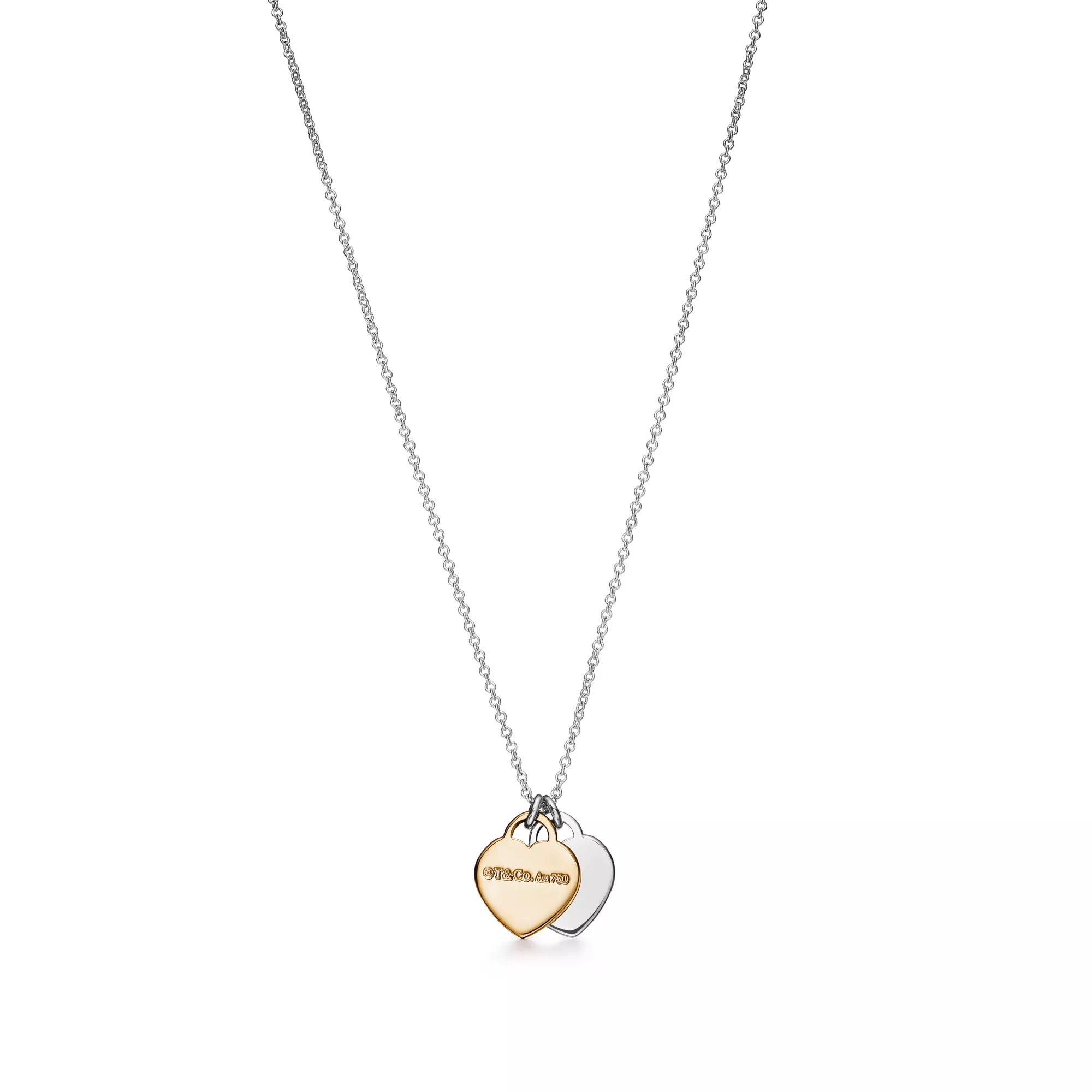 Inspired by a design from 1969, this celebrated collection bears an inscription that reminds one that there's no place like Tiffany. Mini double heart tag pendant in sterling silver and 18k gold. On a 16" chain.