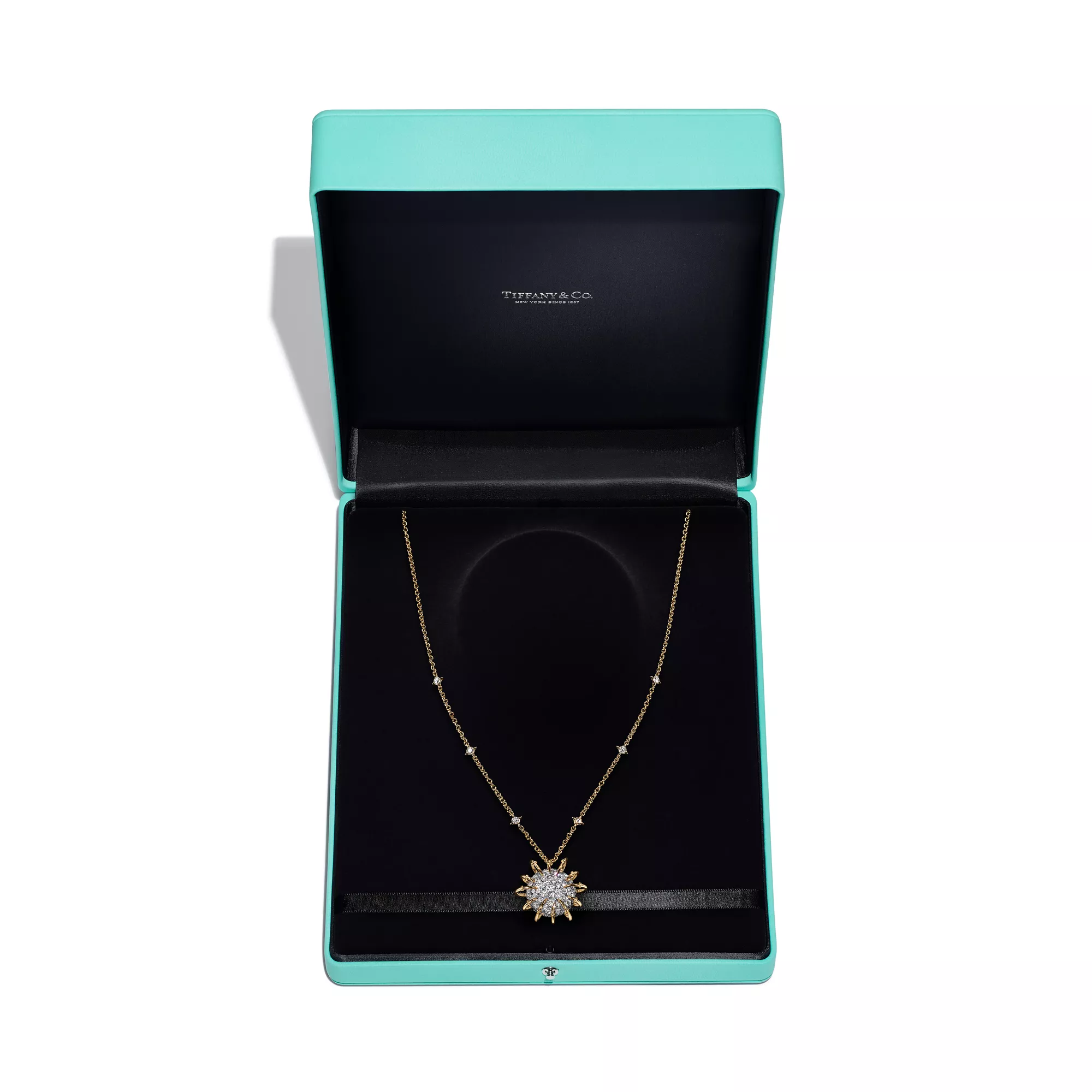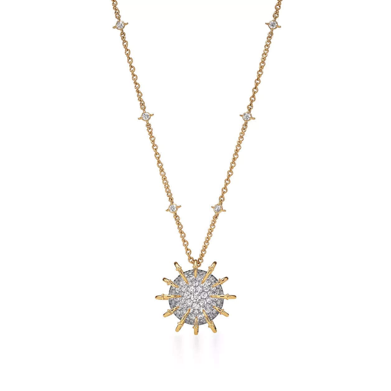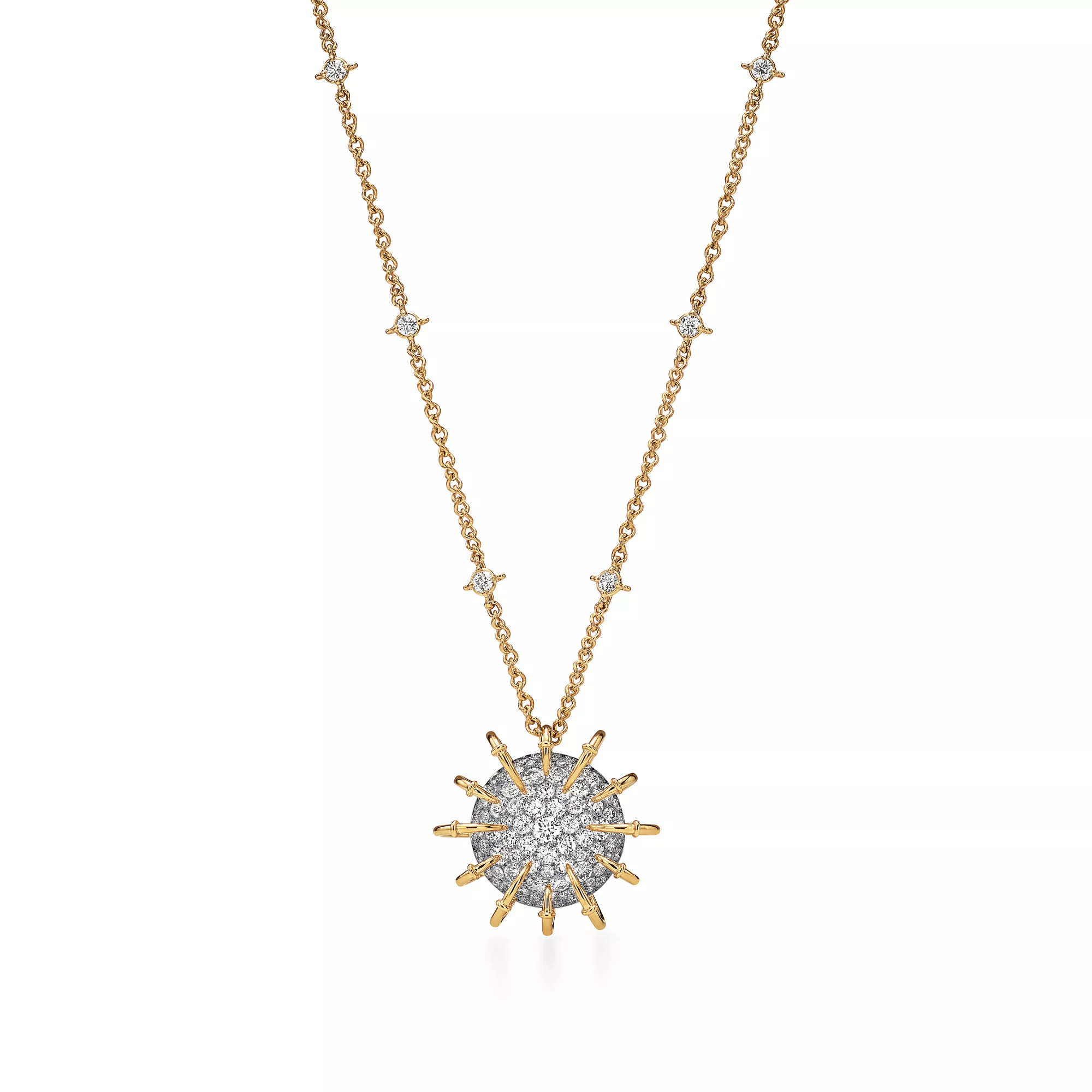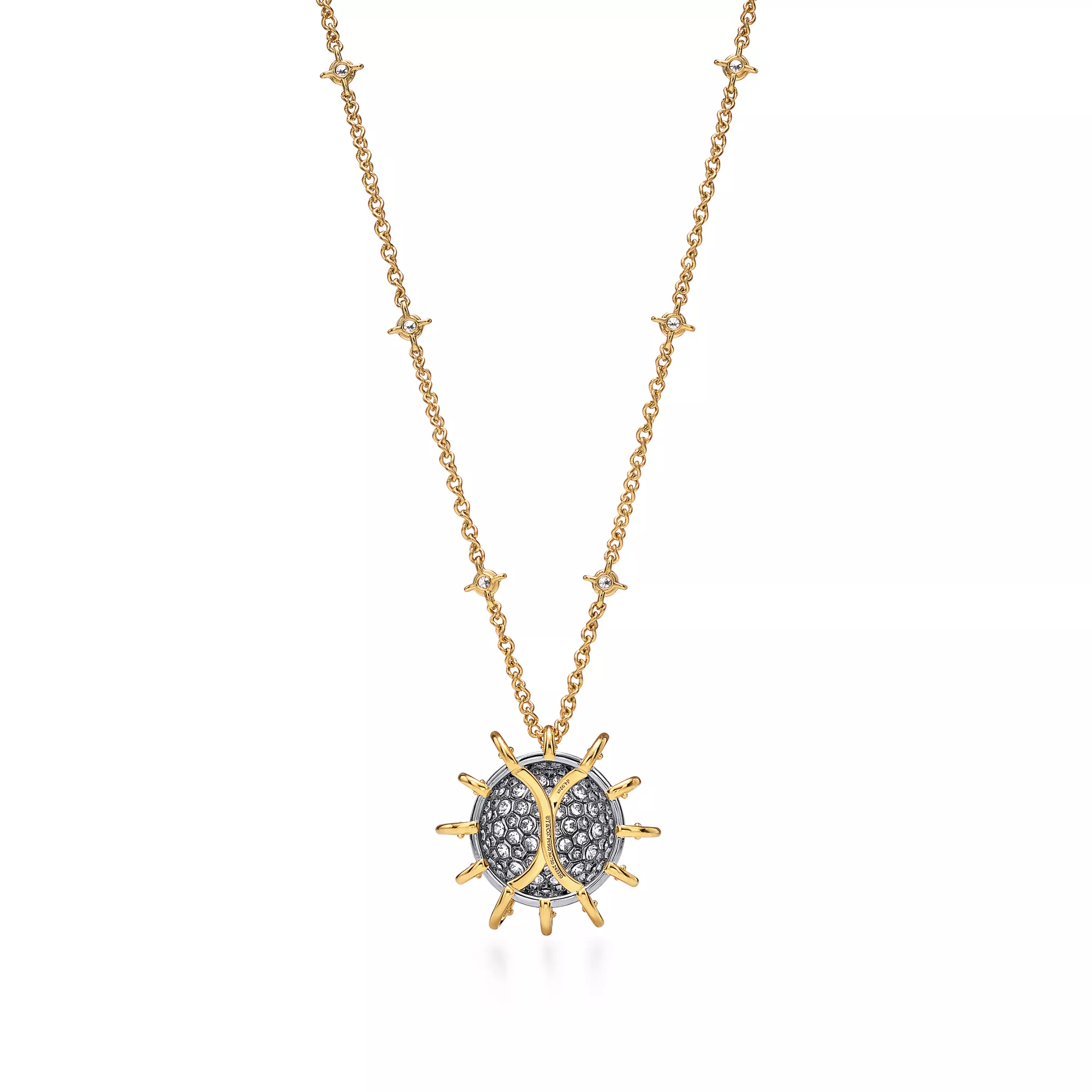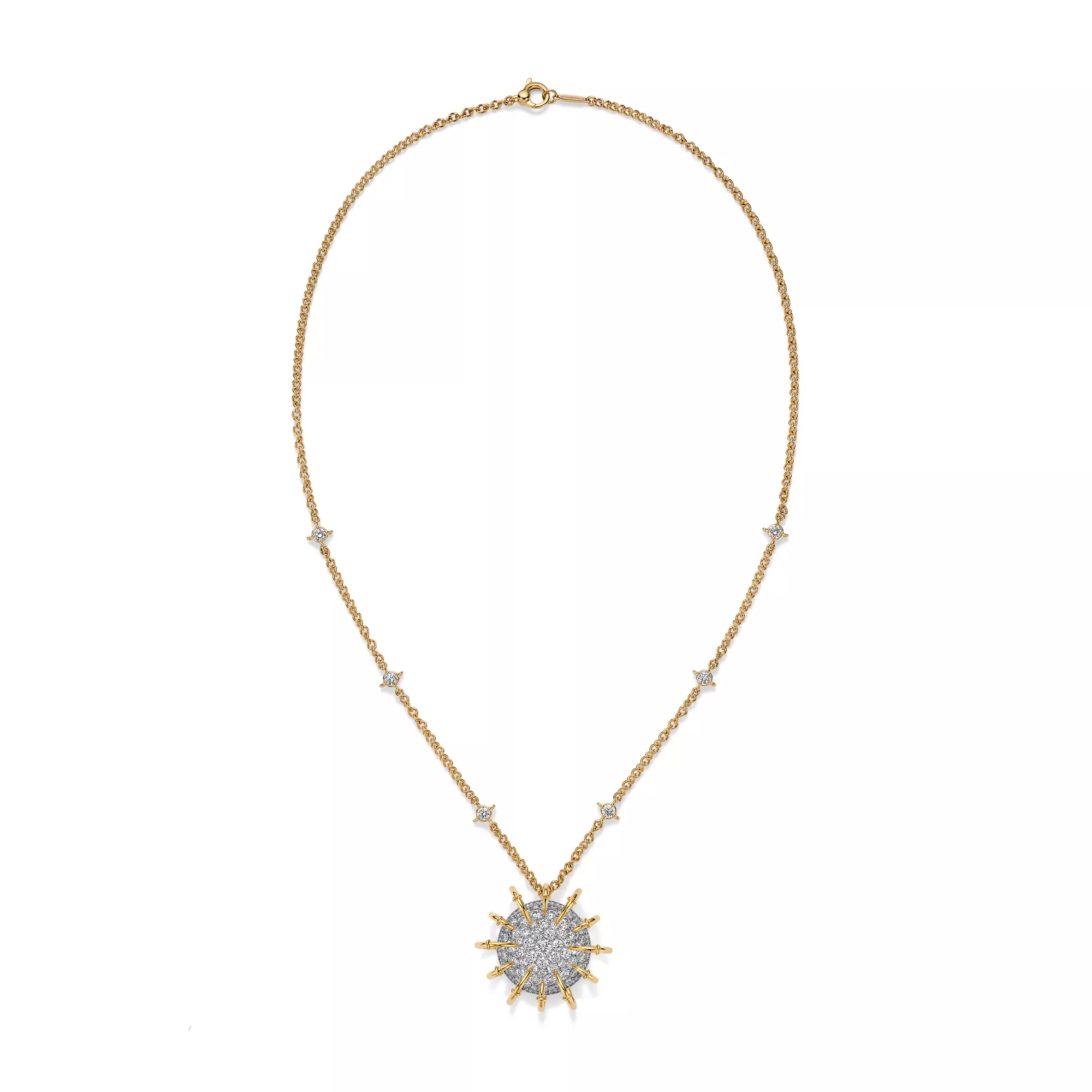 The Apollo by Tiffany collection is inspired by the celestial beauty of the Greek god of the sun. Striking orbs of platinum set with pavé diamonds, and 18k yellow gold rays that curve dramatically from the outer edges to the centre, captivate from every angle. Bold yet elegant, it evokes the eternal brilliance of the sun and is a masterful blend of dimension and volume. Each creation features a unique sculptural dome effect on the underside, where an exposed mise-á-jour setting allows light to enter from beneath, amplifying the radiance of each diamond. Drawing from a brooch first designed by Jean Schlumberger in 1957 as a tribute to Apollo, the collection has expanded into an array of fantastical pieces with unparalleled depth.