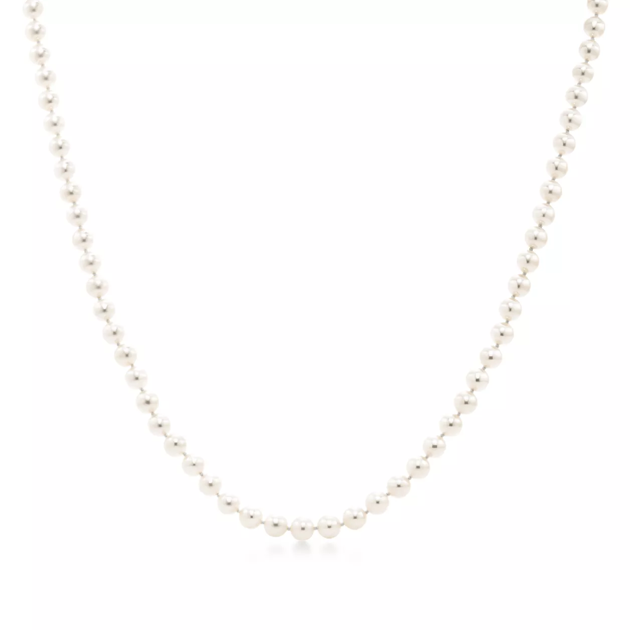 Necklace of Akoya cultured pearls with an 18k white gold clasp. 18" long. Decorative tag in 18k white gold is inscribed with "Tiffany & Co." in script. Pearls, 7-7.5 mm.