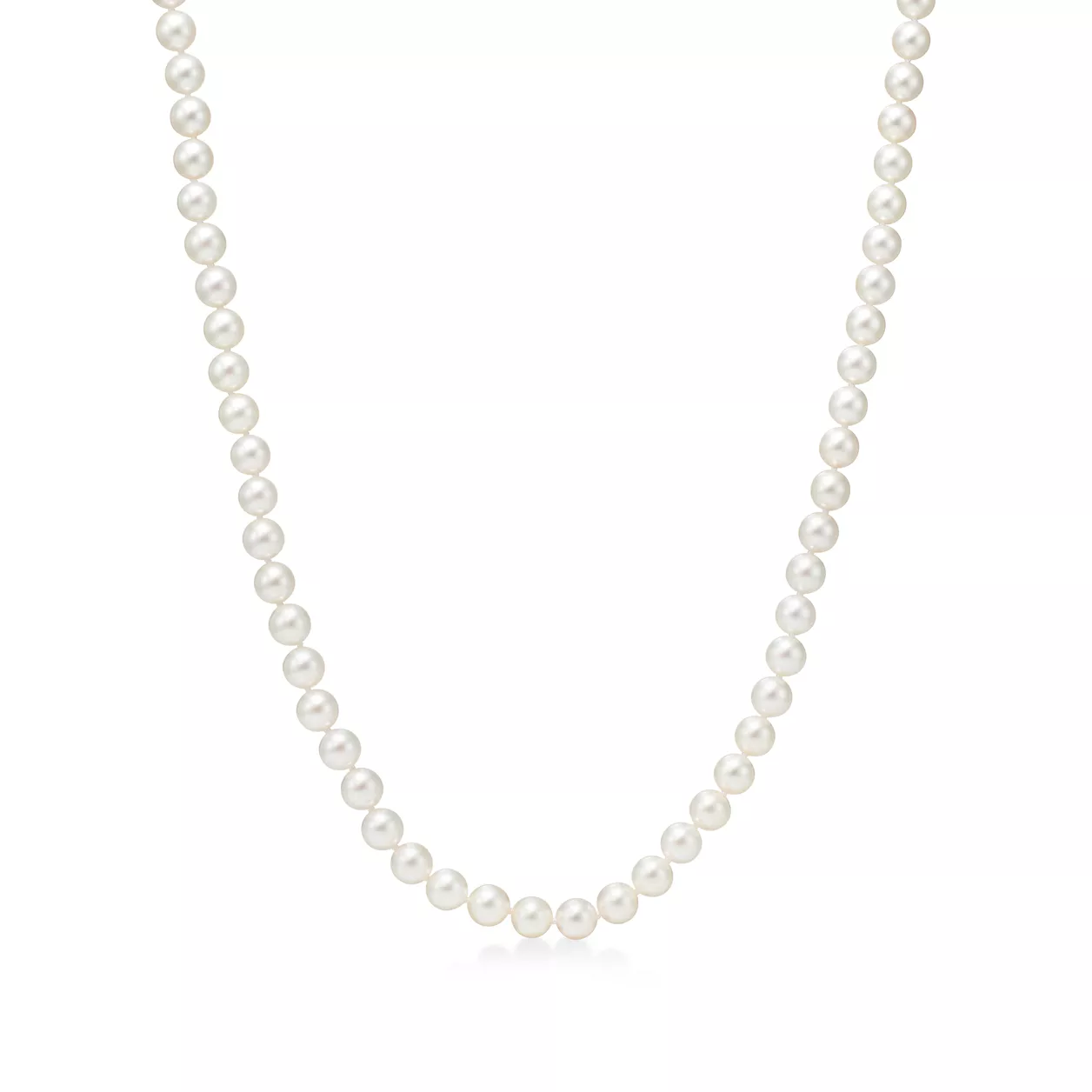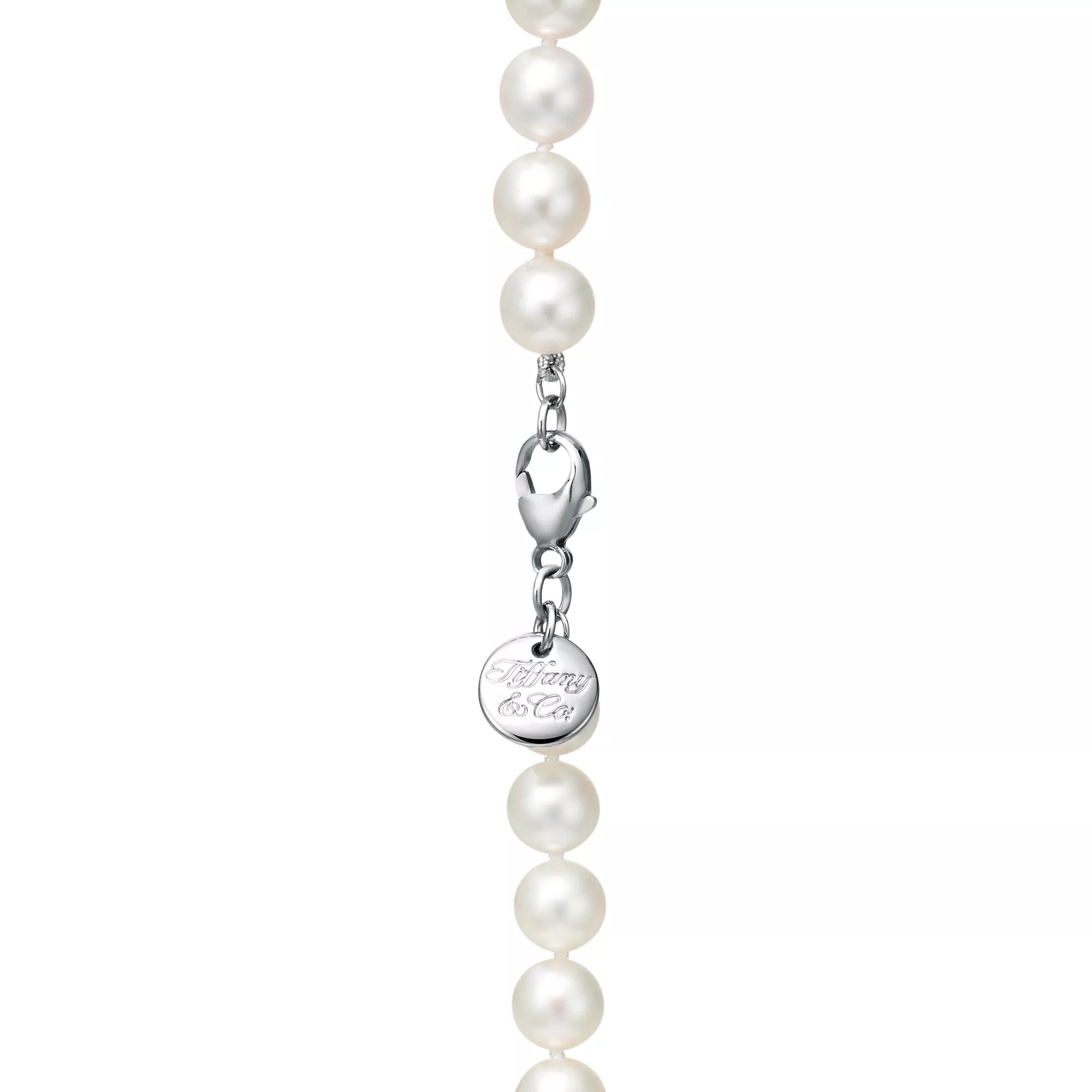 Necklace of Akoya cultured pearls with an 18k white gold clasp. 16" long. Decorative tag in 18k white gold is inscribed with "Tiffany & Co." in script. Pearls, 7-7.5 mm.