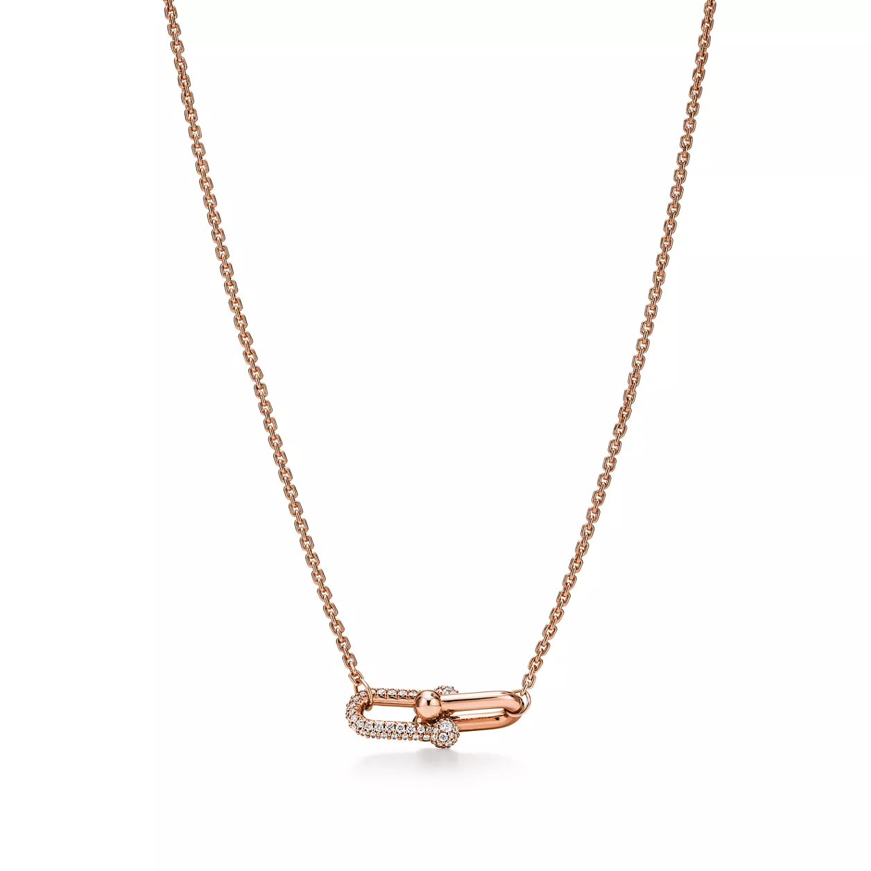 Tiffany HardWear is an expression of love’s transformative strength. Inspired by a quintessential bracelet from 1962 found in the House’s archives, HardWear embodies enduring resilience and uninhibited spirit. Today, Tiffany HardWear perpetuates this sentiment with a collection rooted in the freedom and strength that one finds in love. Like the city in which it was born, HardWear embodies the ability to be free. The collection’s signature gauge link graces an array of dynamic designs. Innovative, artfully engineered clasps create seamless canvases throughout the collection. Crafted with character, each link is finished by hand—a delicate balance of presence and proportion—then joined together, one by one, into an elegant whole. This 18k rose gold and diamond small double link necklace is as bold as it is versatile. Wear this necklace on its own or layer it with HardWear necklaces of varying lengths for an unexpected look.