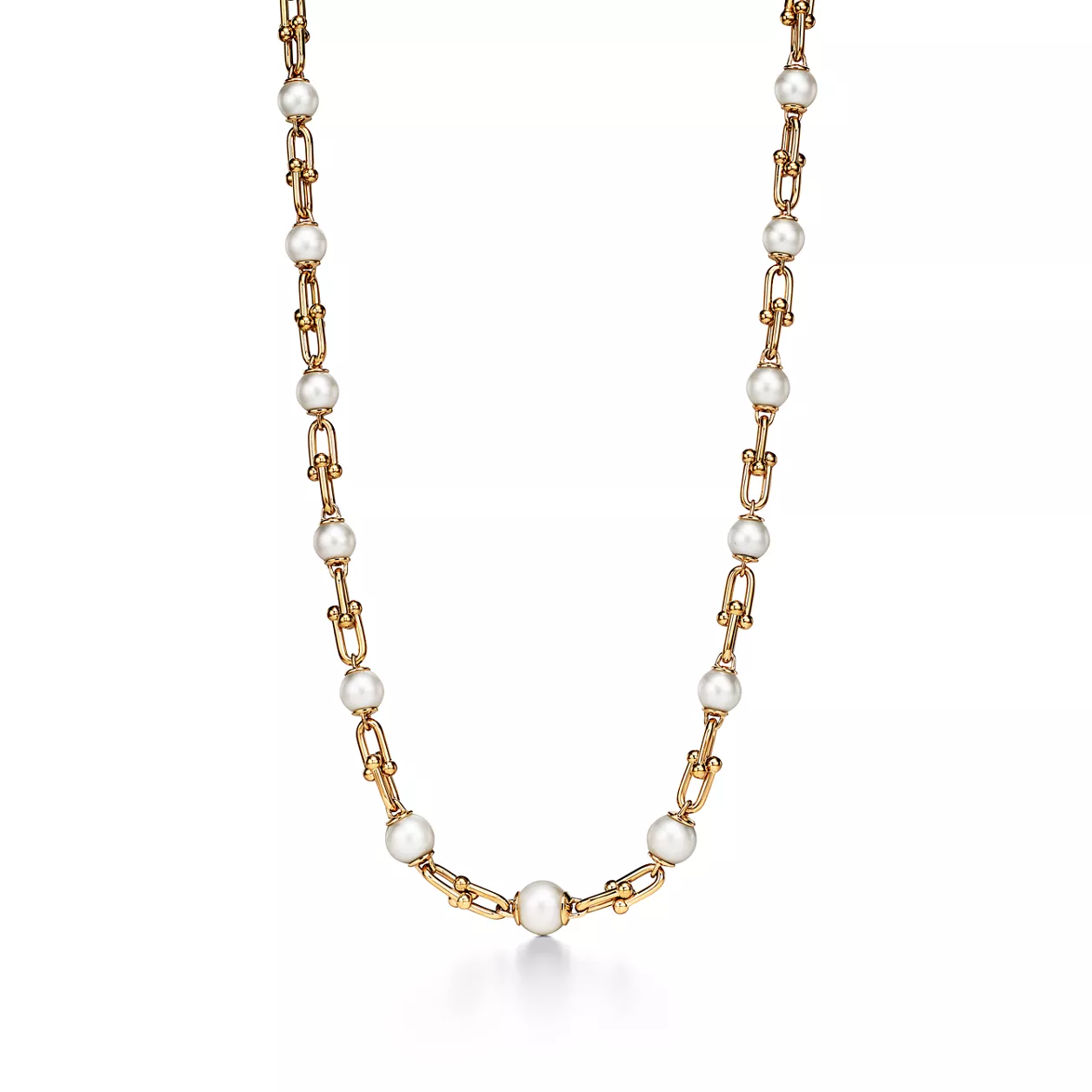 Tiffany HardWear is an expression of love’s transformative strength. Inspired by a quintessential bracelet from 1962 found in the House’s archives, HardWear embodies enduring resilience and uninhibited spirit. This 18k yellow gold necklace features the collection’s signature gauge links with freshwater pearls in graduating proportions—a striking interplay of textures and shapes. It’s beautiful worn on its own or with other delicate chains.