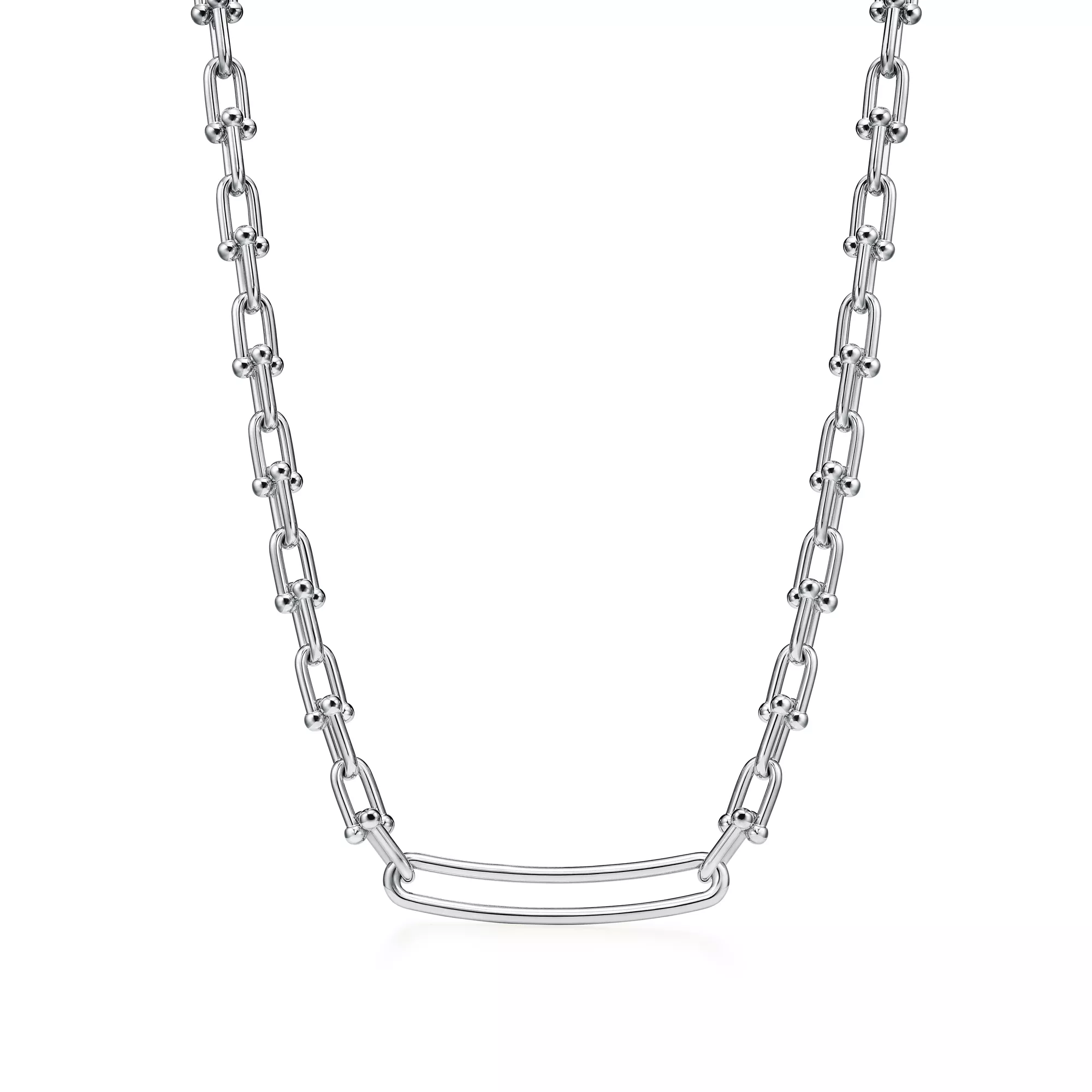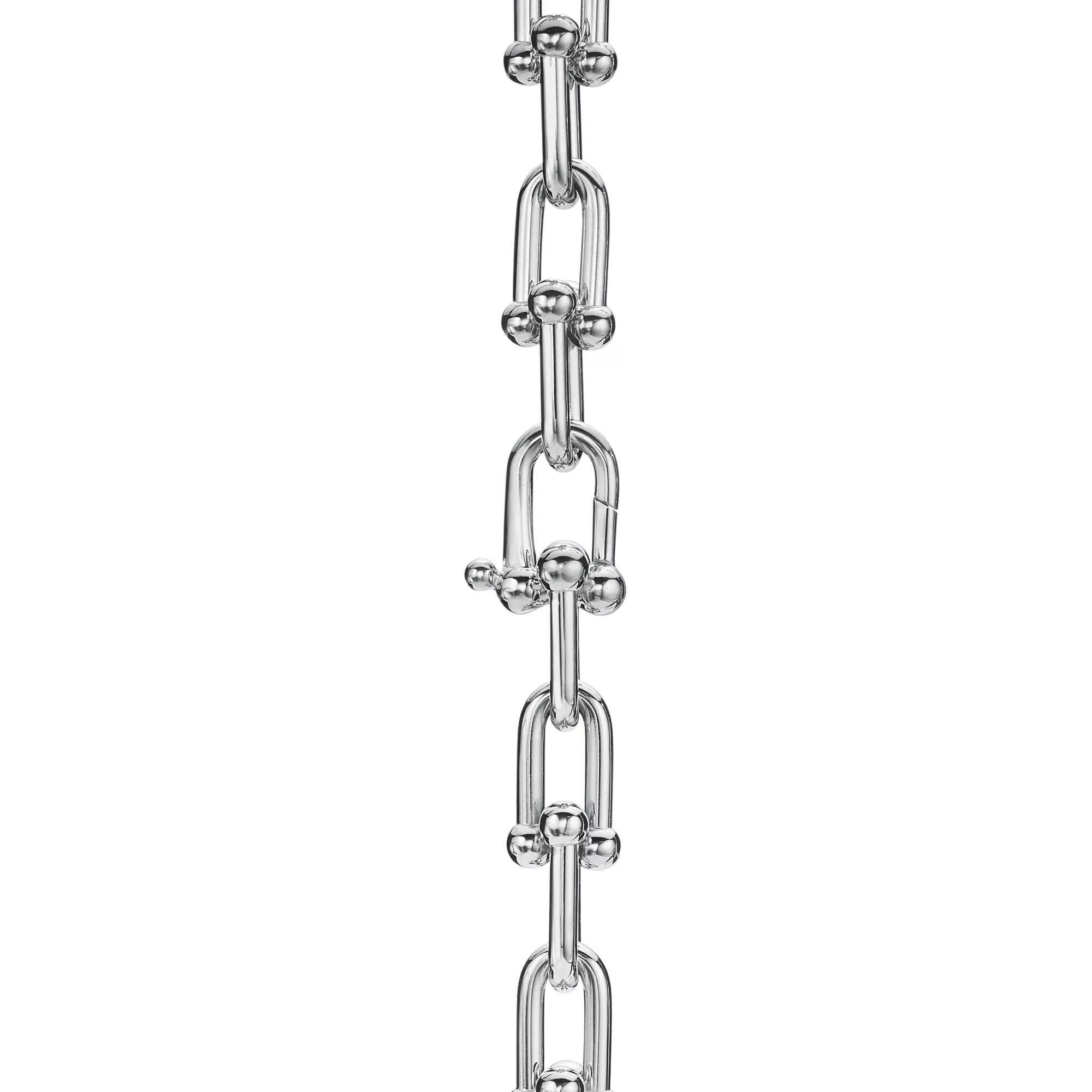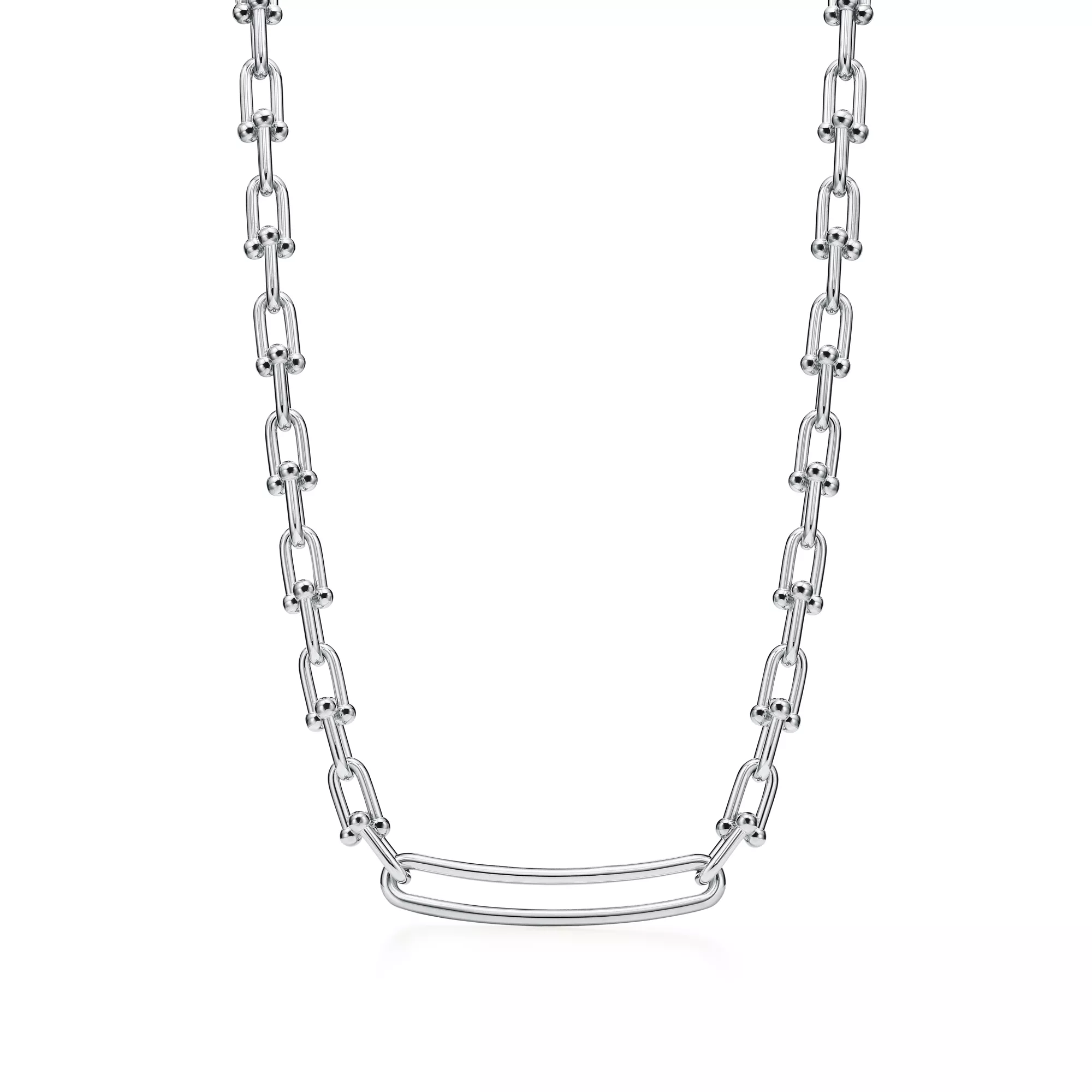 Tiffany HardWear is an expression of love's transformative strength. Inspired by a quintessential bracelet from 1962 found in the House's archives, HardWear embodies enduring resilience and uninhibited spirit. Here, the collection's signature gauge link is strikingly transformed into an elongated necklace in sterling silver. Each link is finished by hand—a delicate balance of presence and proportion—then joined together, one by one, into an elegant whole, creating a modern statement piece. For a bold look, pair this necklace with other HardWear designs in sterling silver or mix metals for an unexpected contrast.