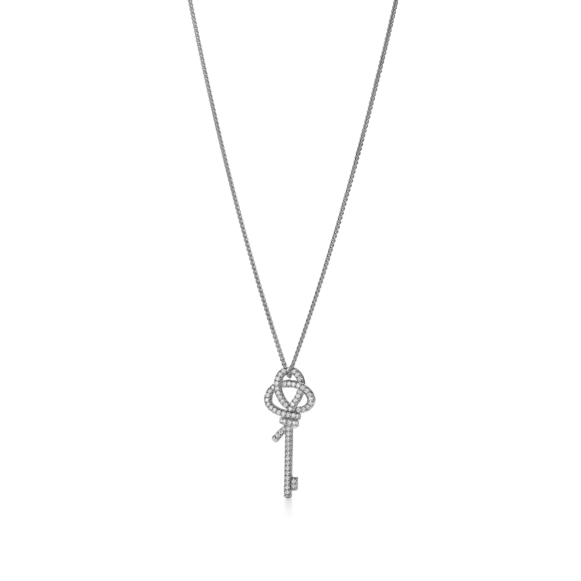 Tiffany Knot is an expression of love’s unwavering bonds. Inspired by an archival bow crafted in 1889, Knot is a symbol of life’s most enduring ties and meaningful connections. This pendant is crafted of platinum and polished by hand for high shine. Each round brilliant diamond—specifically chosen to meet Tiffany’s high standards—is hand set at precise angles to maximise brilliance. Wear this pendant on its own or partnered with classic silhouettes for an unexpected pairing.
