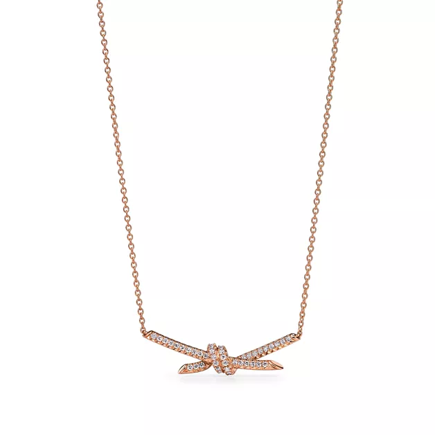 Tiffany Knot is an expression of love’s unwavering bonds. Inspired by an archival bow crafted in 1889, Knot is a symbol of life’s most enduring ties and meaningful connections. This pendant is crafted with rose gold and polished by hand for high shine. Each round brilliant diamond—specifically chosen to meet Tiffany’s high standards—is hand set at precise angles to maximise brilliance. Wear this pendant on its own or partnered with pendants of various lengths for a bold look.