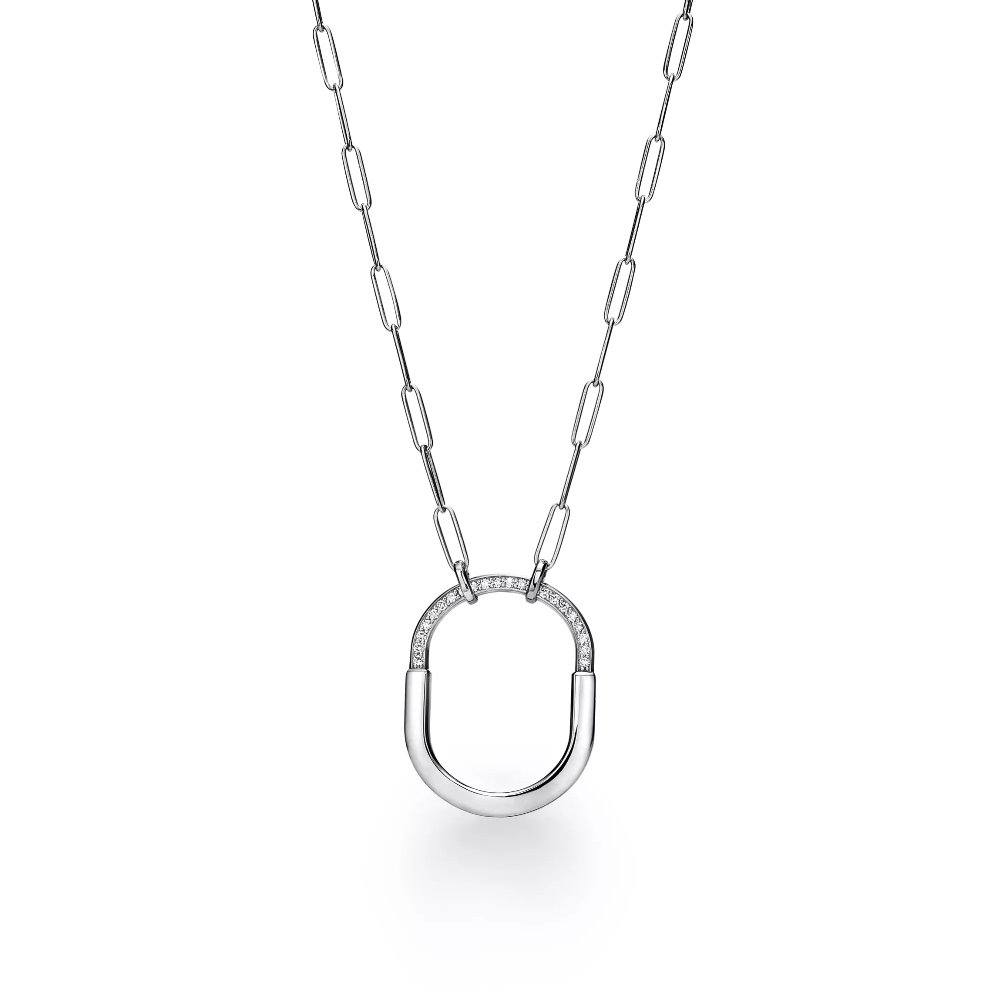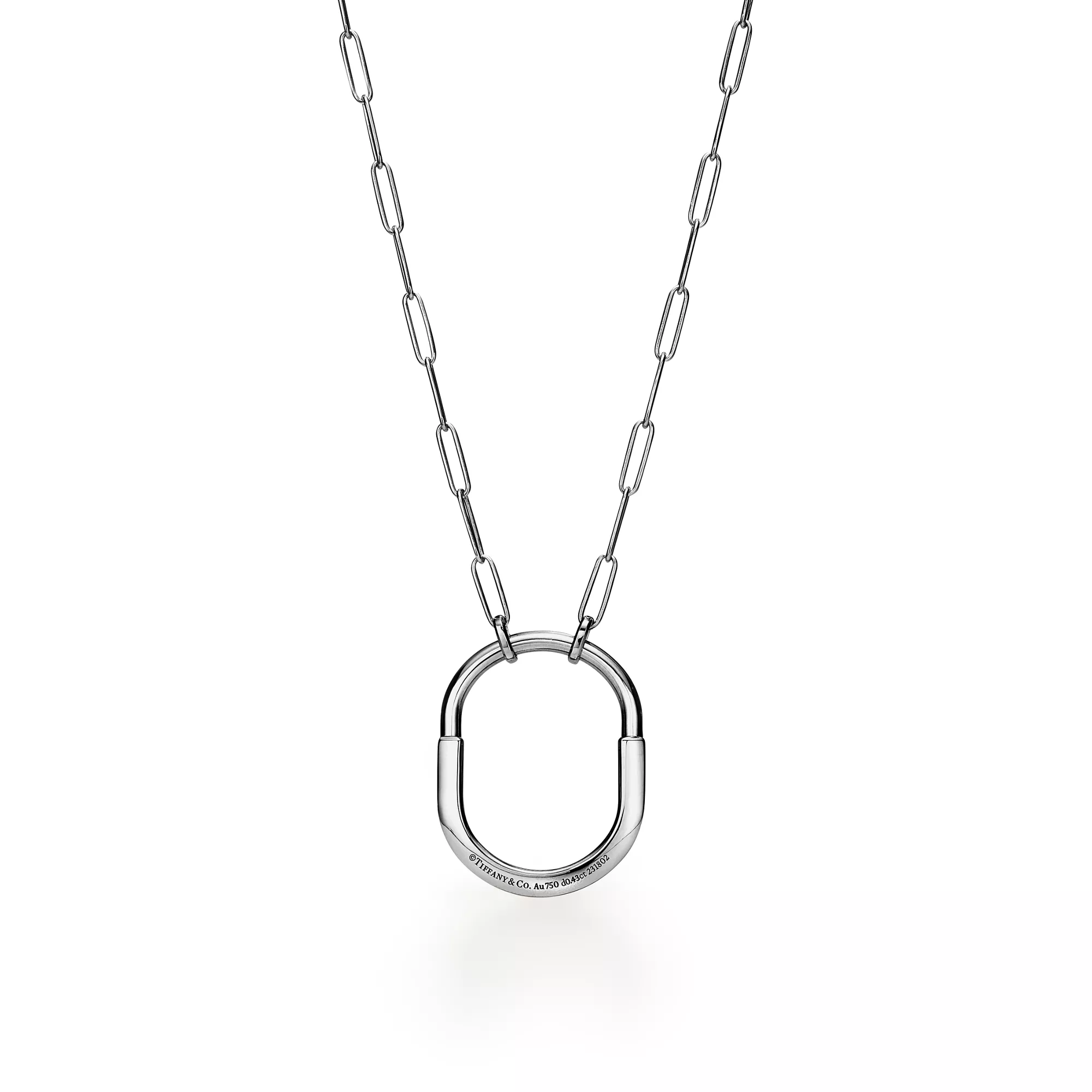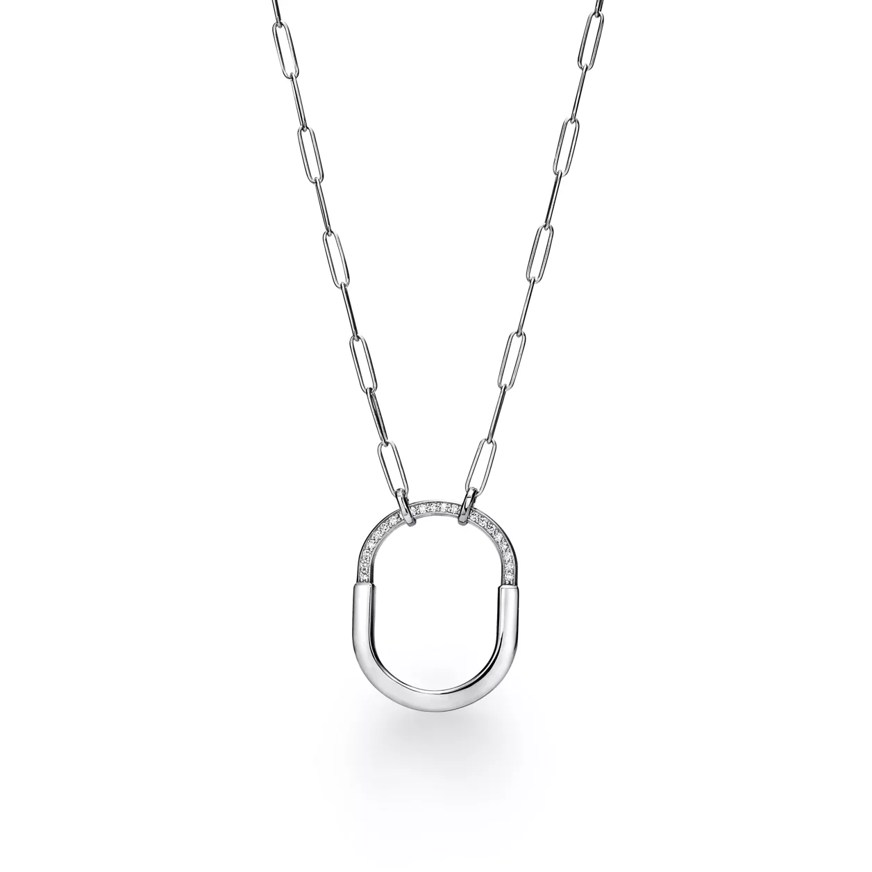 Tiffany Lock is an expression of love’s enduring protection, inspired by a padlock from The Tiffany Archives that dates to 1883. Designed to keep safe that which is cherished, Lock is a universal symbol of what matters most. This pendant features a striking oval link chain that echoes the Lock motif. It’s expertly crafted in 18k white gold with hand-set diamonds.