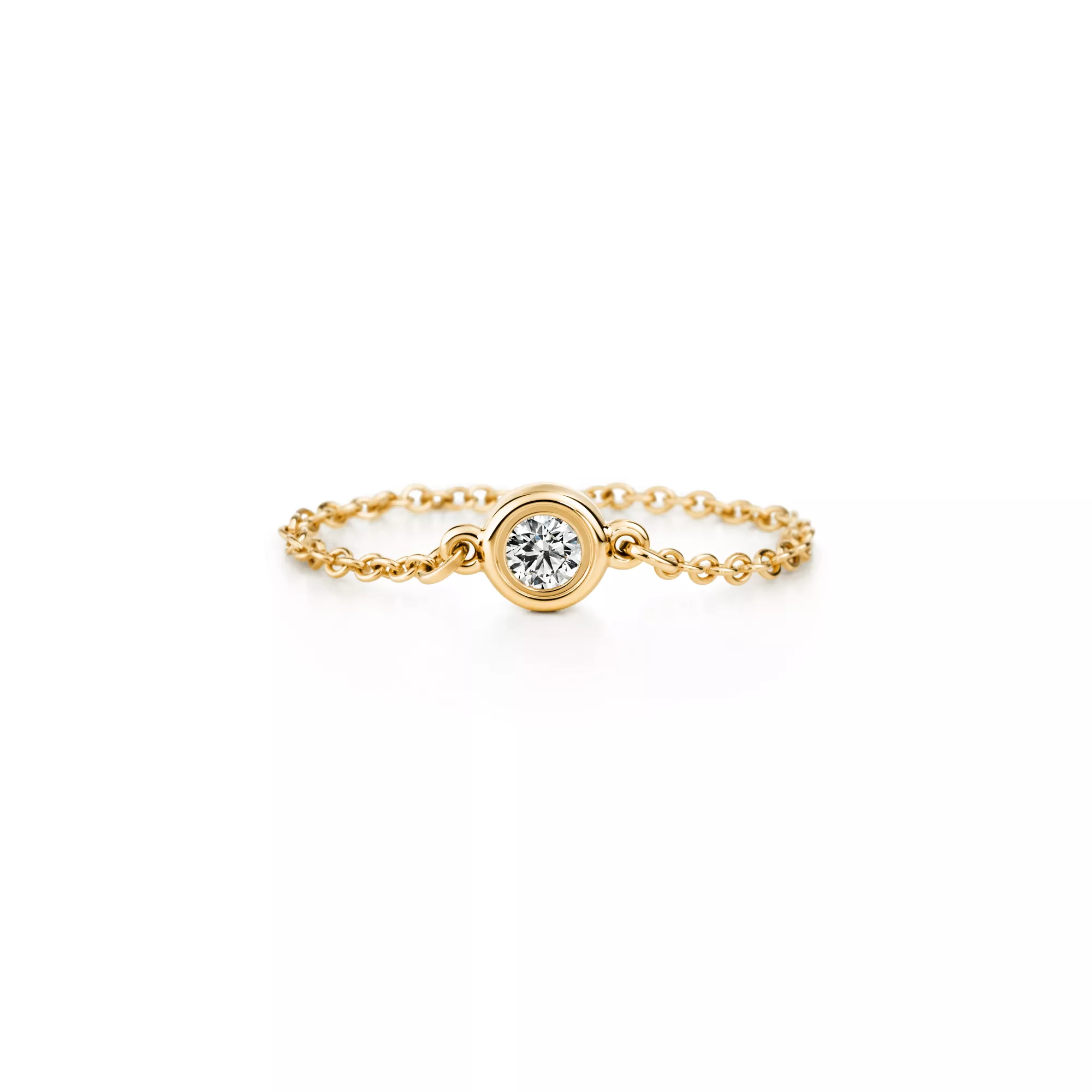 Tiffany round diamonds catch the light and make it dance. Ring in 18k gold with a round brilliant diamond. Carat weight .07. Original designs copyrighted by the Nando and Elsa Peretti Foundation.