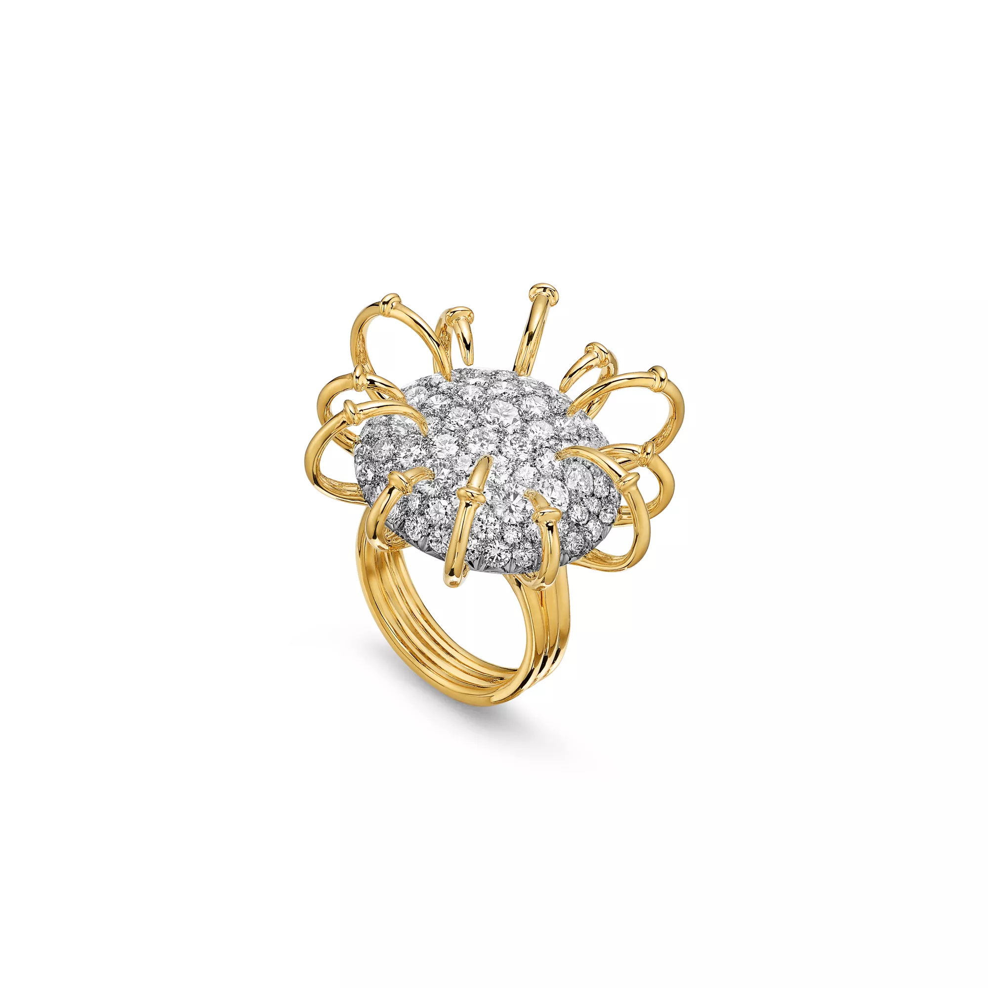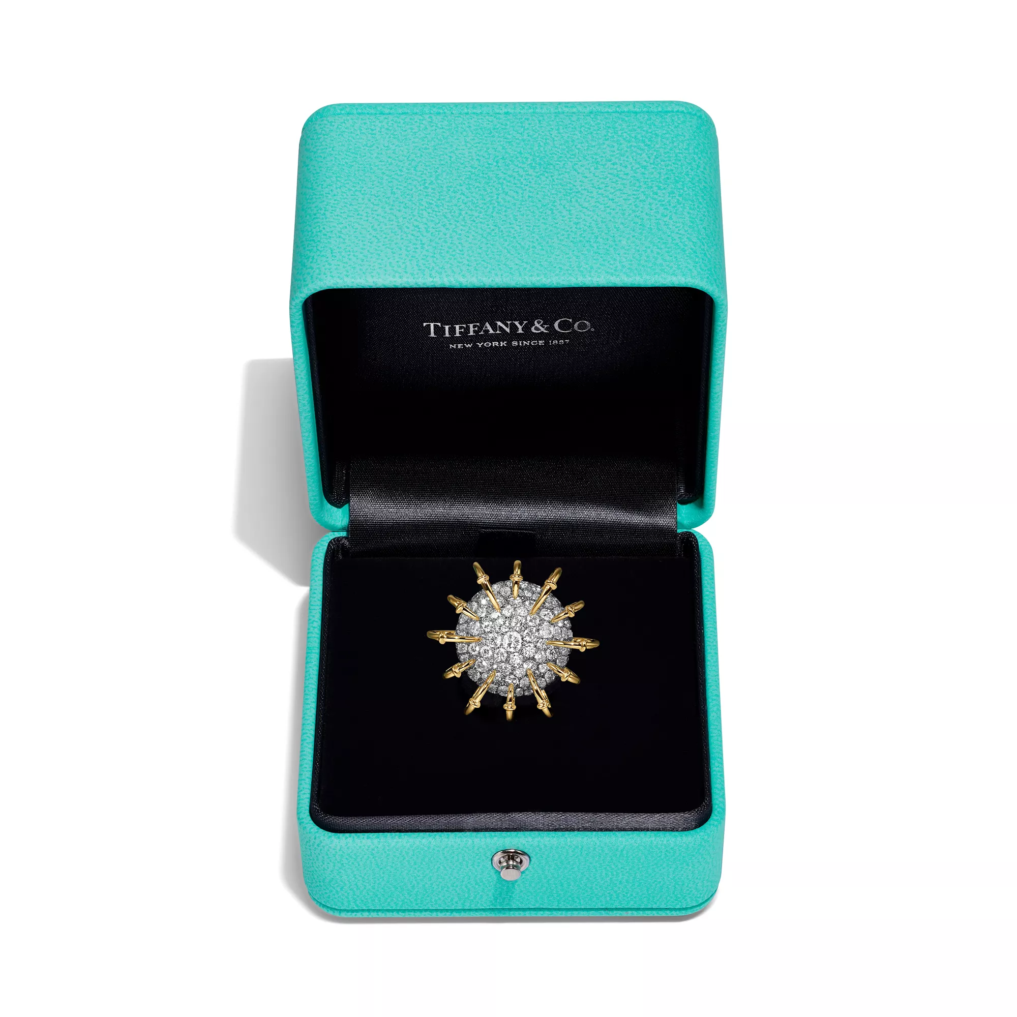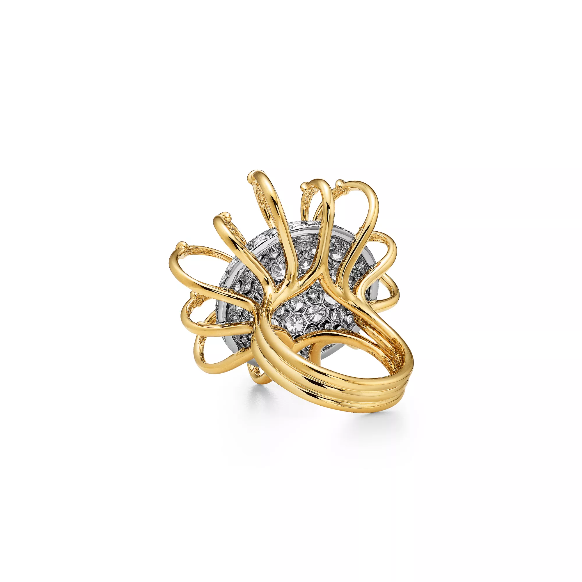 The Apollo by Tiffany collection is inspired by the celestial beauty of the Greek god of the sun. Striking orbs of platinum set with pavé diamonds, and 18k yellow gold rays that curve dramatically from the outer edges to the centre, captivate from every angle. Bold yet elegant, it evokes the eternal brilliance of the sun and is a masterful blend of dimension and volume. Each creation features a unique sculptural dome effect on the underside, where an exposed mise-á-jour setting allows light to enter from beneath, amplifying the radiance of each diamond. Drawing from a brooch first designed by Jean Schlumberger in 1957 as a tribute to Apollo, the collection has expanded into an array of fantastical pieces with unparalleled depth.
