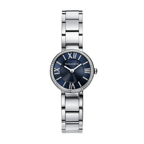Women's watch in stainless steel. White dial set with round brilliant diamonds. Carat total weight .28. 24 mm case. Quartz movement. Water resistant to 30 meters/100 feet/3 ATM. Swiss-made.