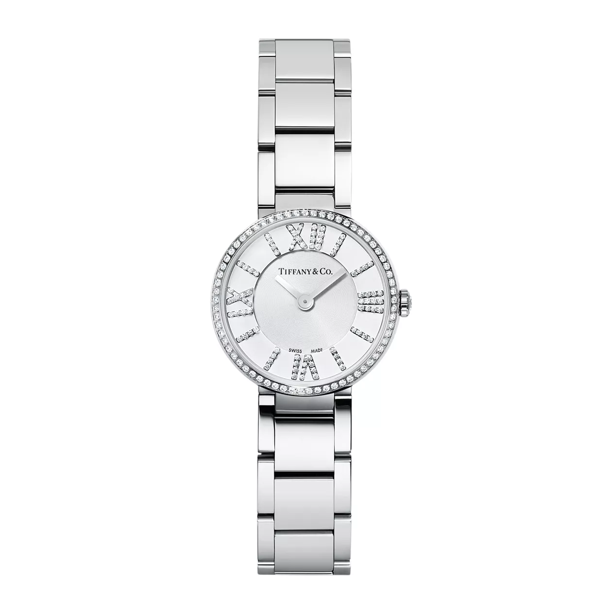 Women's watch in stainless steel. White dial set with round brilliant diamonds. Carat total weight .28. 24 mm case. Quartz movement. Water resistant to 30 meters/100 feet/3 ATM. Swiss-made.