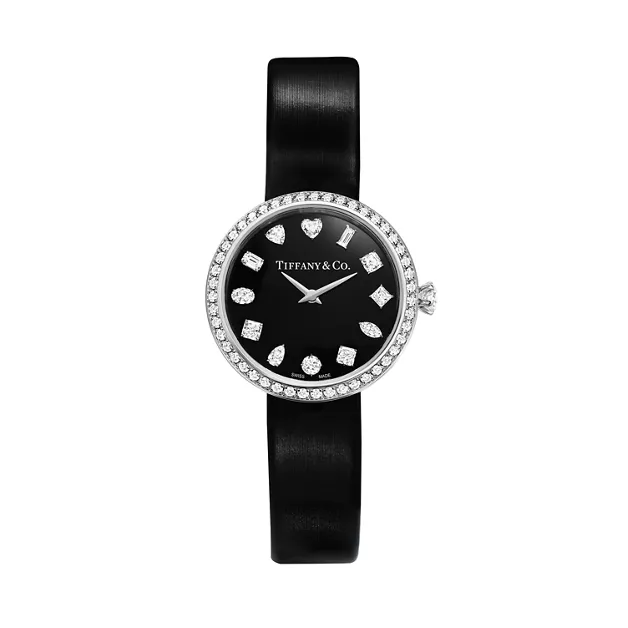 Tiffany Eternity watches remind us to live in the now. Inspired by a series of vintage Tiffany & Co. advertisements from the 1960s and ’70s, the dial features a different diamond cut at each hour marker: round brilliant, baguette, cushion, Tiffany True®, marquise, Asscher, heart, pear, oval, emerald, triangle and princess. The watch’s crown is inspired by the Tiffany® Setting engagement ring and adopts its iconic six-prong setting—a beautiful complement to the halo of round brilliant diamonds that encircle the case. This white gold watch features a black brushed calf strap set with round brilliant diamonds on the buckle. This striking display of craftsmanship honours our heritage of offering the best diamonds in the world—then, now and always.