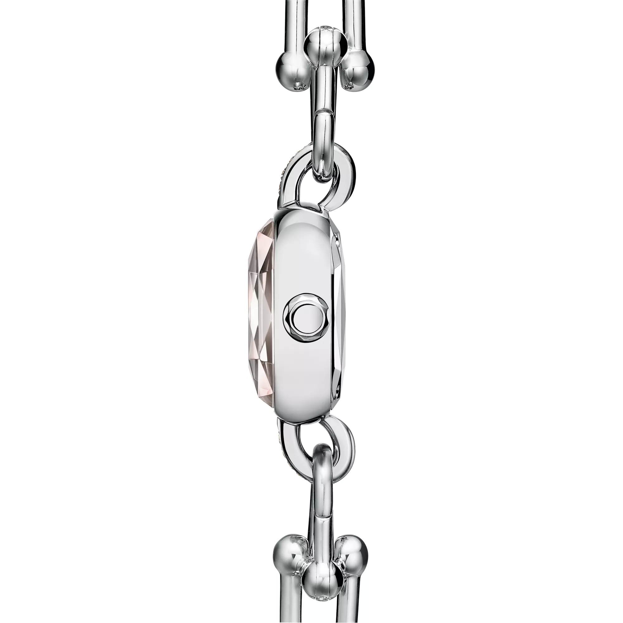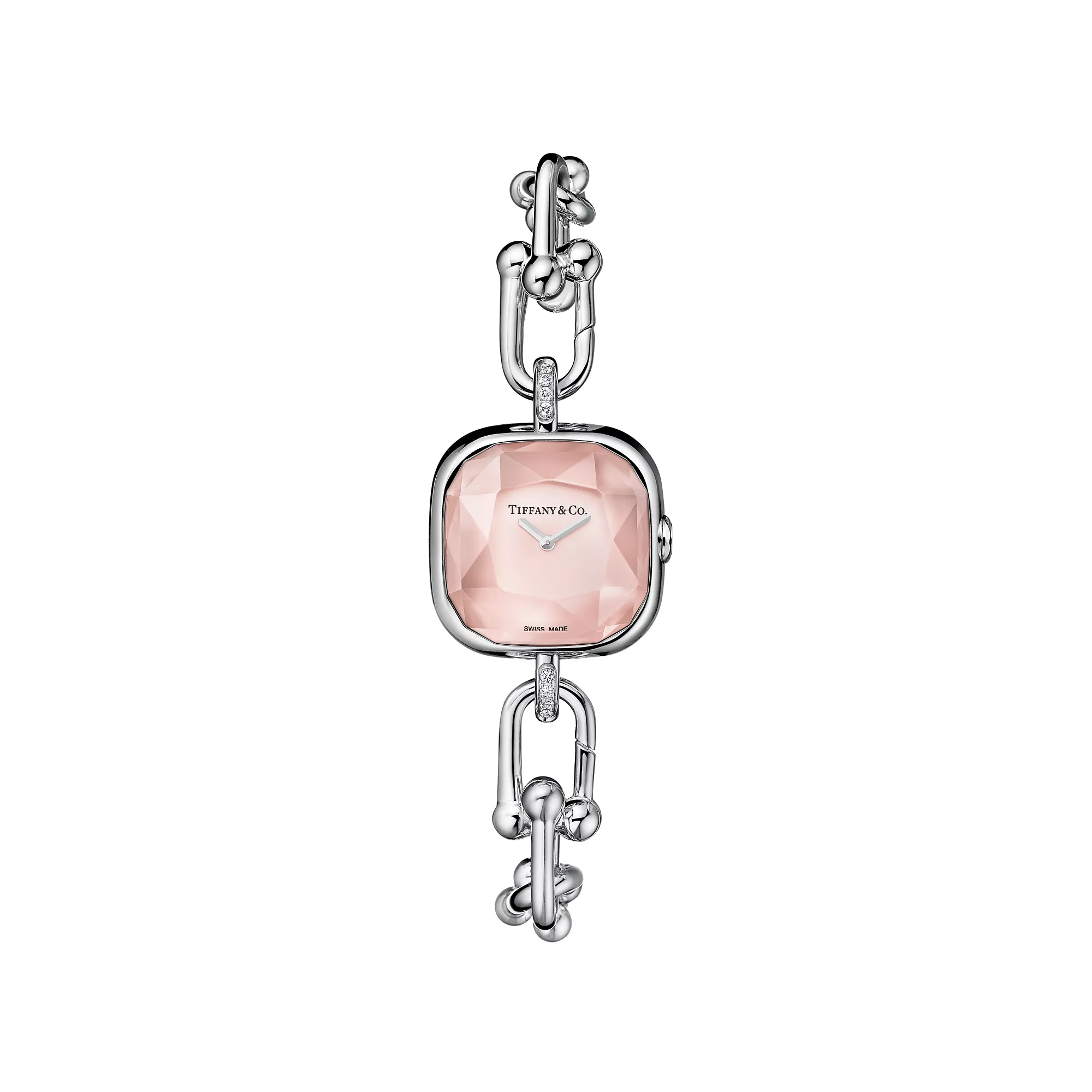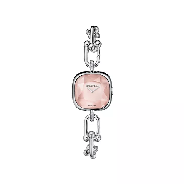 Tiffany HardWear is an expression of love’s transformative strength. Inspired by a quintessential bracelet from 1962 found in the House’s archives, HardWear embodies enduring resilience and uninhibited spirit. Handcrafted in Switzerland, each Tiffany HardWear watch features the iconic gauge links and brilliant diamonds. This sterling silver and steel watch features diamonds and a pink mother-of-pearl dial. A hidden clasp creates a streamlined design, while a faceted sapphire-glass crystal evokes the unique shape of the legendary Tiffany Diamond. It makes a beautiful statement worn on its own or layered with Tiffany HardWear bracelets.